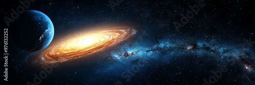 Wall mural a mesmerizing view of a spiral galaxy illuminating a distant planet in the vast expanse of deep spac - Wall murals Wall mural a mesmerizing view of a spiral galaxy illuminating a distant planet in the vast expanse of deep spac - Wall murals