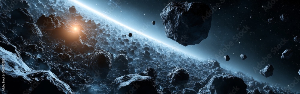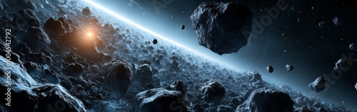 Wall mural : A mesmerizing view of an asteroid belt illuminated by distant stars in the vastness of space during