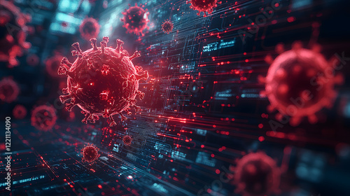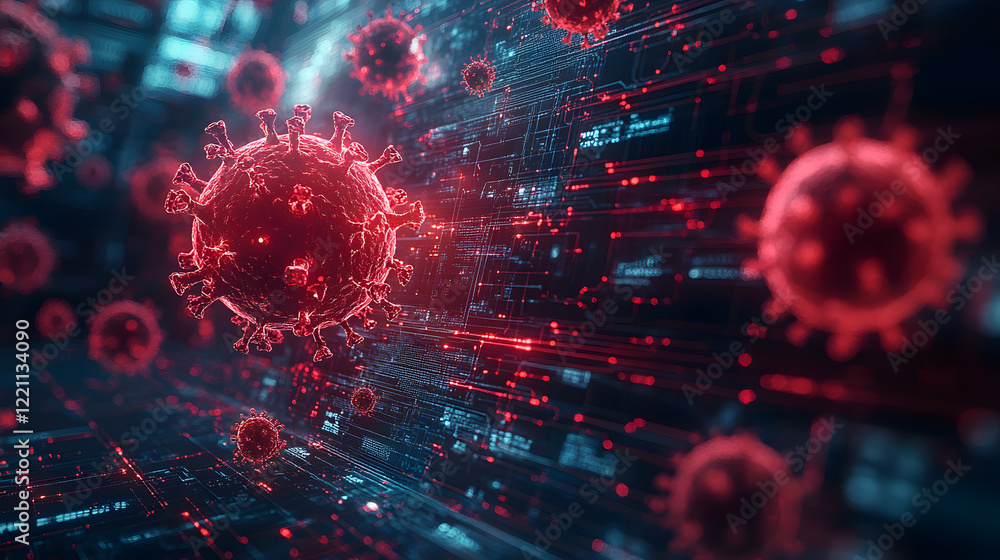 The watermark will not be included on Wall mural.: A microscopic view of a virus particle on a circuit board, representing the intersection of biology