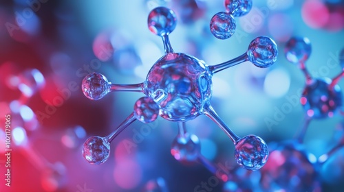 Wall mural a microscopic view of a water molecule's structure in vivid blue and red hues, demonstrating the com