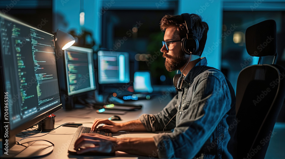 Wall mural a middle-aged programmer with experience sits at a computer and does coding. - Wall murals Wall mural a middle-aged programmer with experience sits at a computer and does coding. - Wall murals