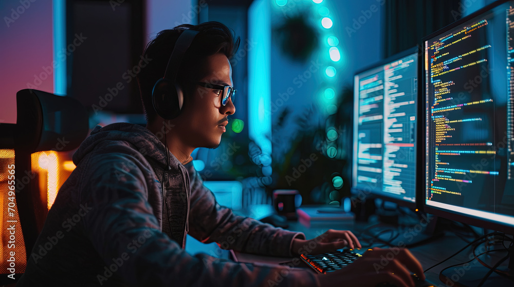 The watermark will not be included on Wall mural.: A middle-aged programmer with experience sits at a computer and does coding -