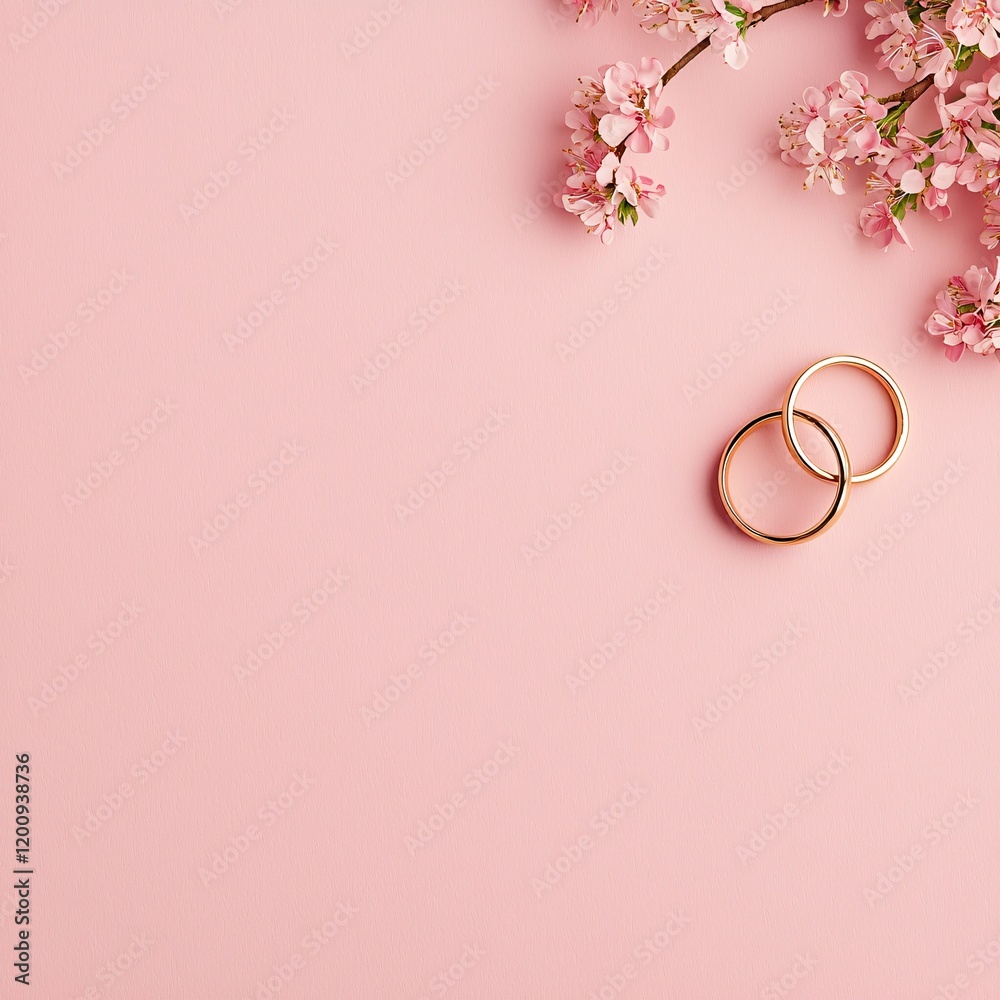 Wall mural a minimalist design featuring two gold wedding bands resting on a soft pink background adorned with  - Wall murals Wall mural a minimalist design featuring two gold wedding bands resting on a soft pink background adorned with - Wall murals