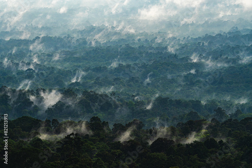 The watermark will not be included on Wall mural.: A misty forest with a thick layer of fog covering the trees