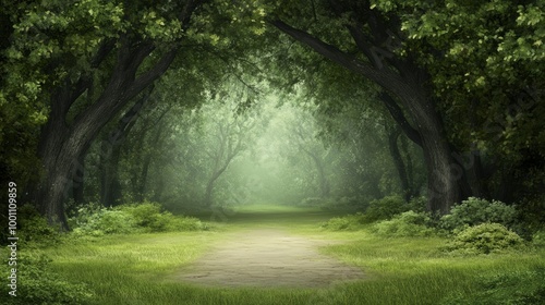 The watermark will not be included on Wall mural.: A misty path winds through a dense forest, sunlight filtering through the leaves, creating a magical
