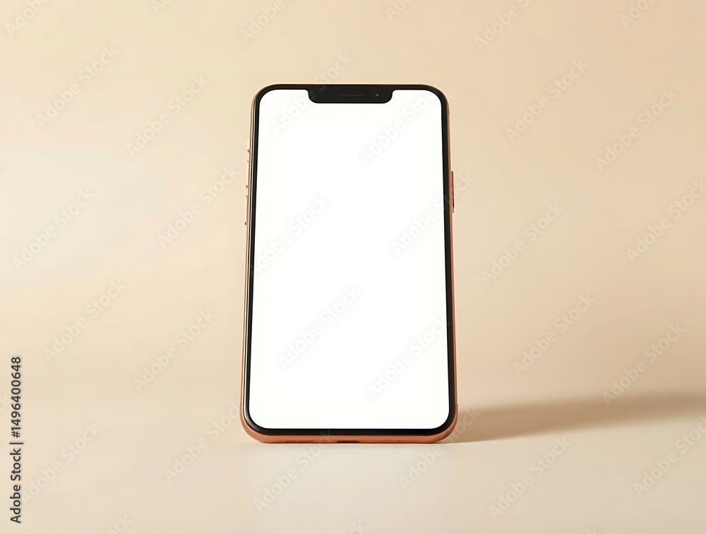 Wall mural : A Modern Black Smartphone With A Notch And A Blank White Screen Stands Upright Against A Soft Beige Background, Casting A Gentle Shadow, Mobile App Mockup, Device Display Template
