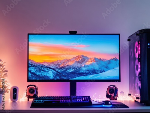 Wall mural : A modern computer setup with vibrant lighting and scenic display -
