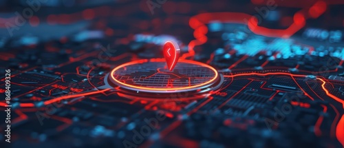 The watermark will not be included on Wall mural.: A modern cyber interface highlighting a neonlit point on an interactive map with copy space