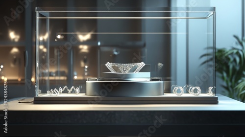 Wall mural a modern glass display case showcasing a silver sculpture on a rotating platform. the display is ill