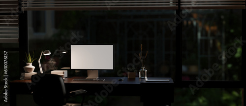 Wall mural a modern office room at night with light from a table lamp, a computer mockup on a desk