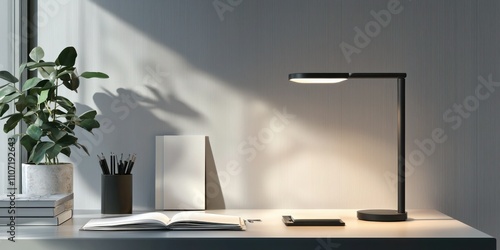 A modern table lamp mockup with a sleek design placed on a minimalist desk, surrounded by office supWall mural