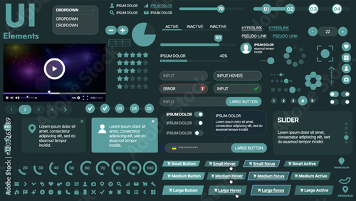 Wall mural : A modern ui kit featuring a collection of buttons, icons, navigation menus, and responsive design el