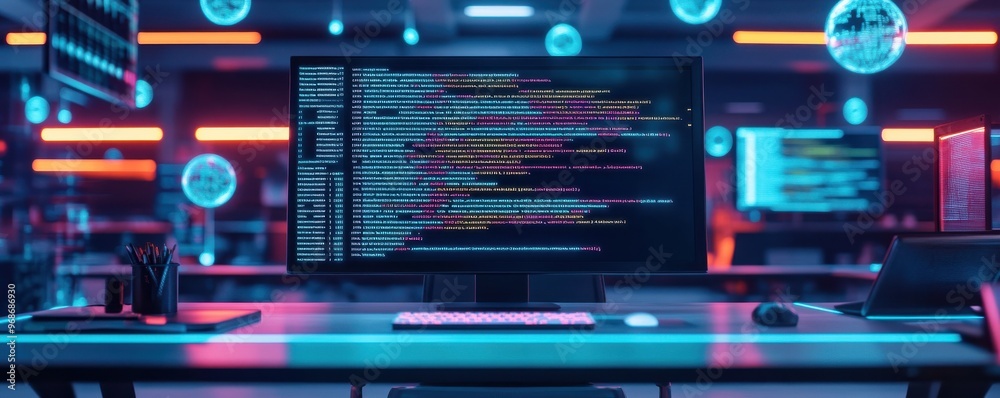 Wall mural : A modern workspace featuring a computer monitor displaying colorful code, illuminated by vibrant neo