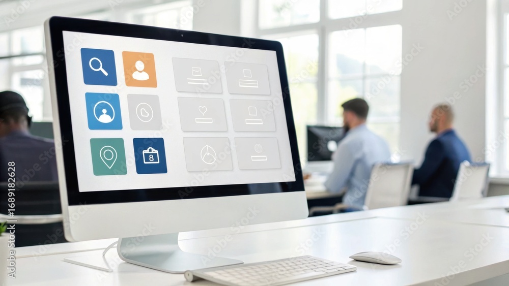 A modern workspace featuring a computer with a user interface, displaying various application icons,Wall mural
