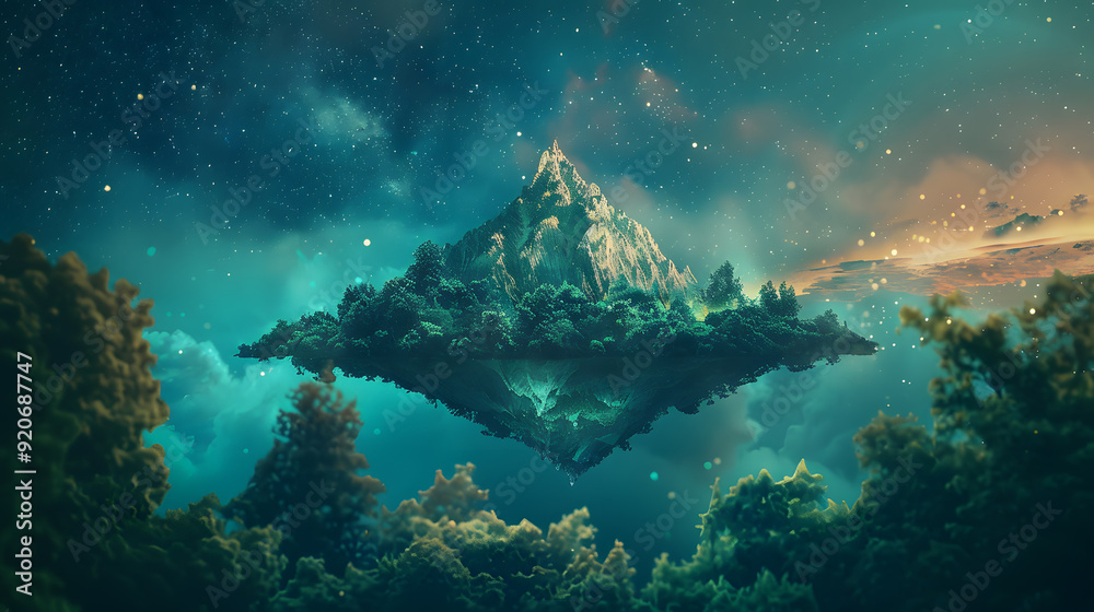 The watermark will not be included on Wall mural.: A mountain with a tree on top of it is floating in the sky -