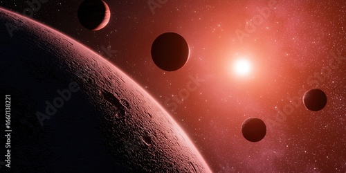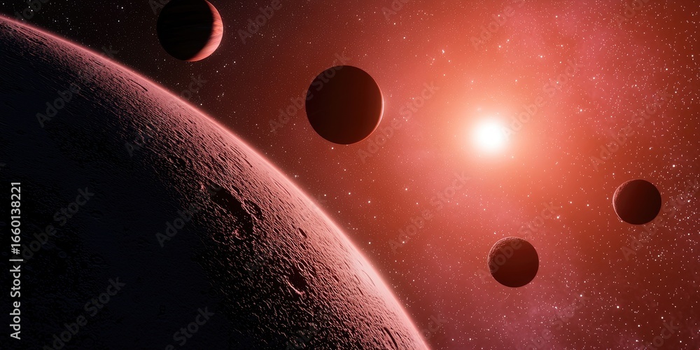 Wall mural a multi-planet system orbiting a distant star, showing planets of varying sizes and colors, highligh - Wall murals Wall mural a multi-planet system orbiting a distant star, showing planets of varying sizes and colors, highligh - Wall murals