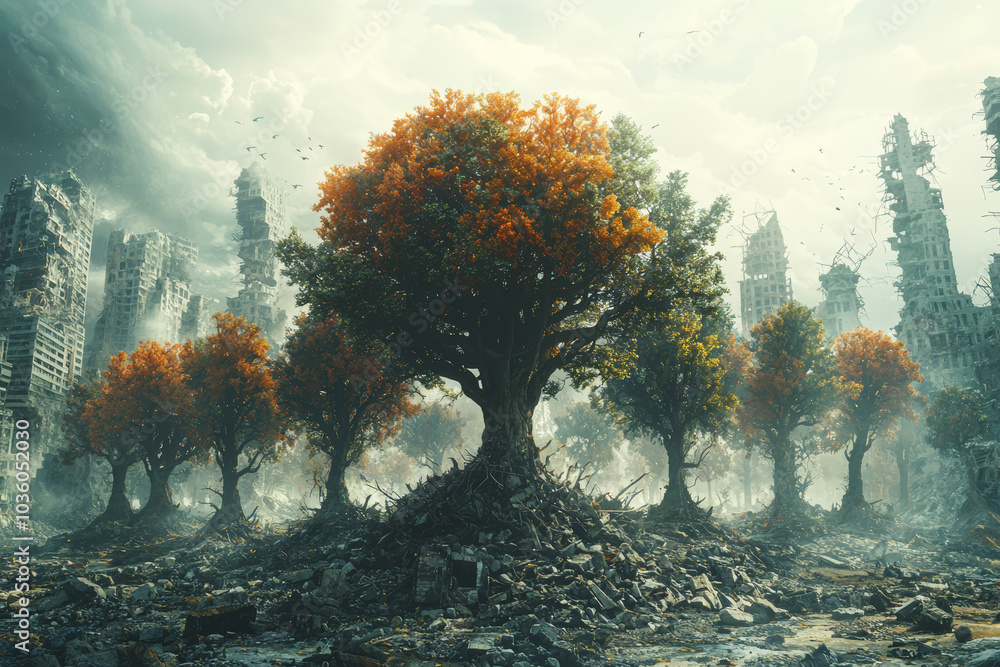 Wall mural a multiverse where earth exists in different forms--one thriving, another in ruin--representing the