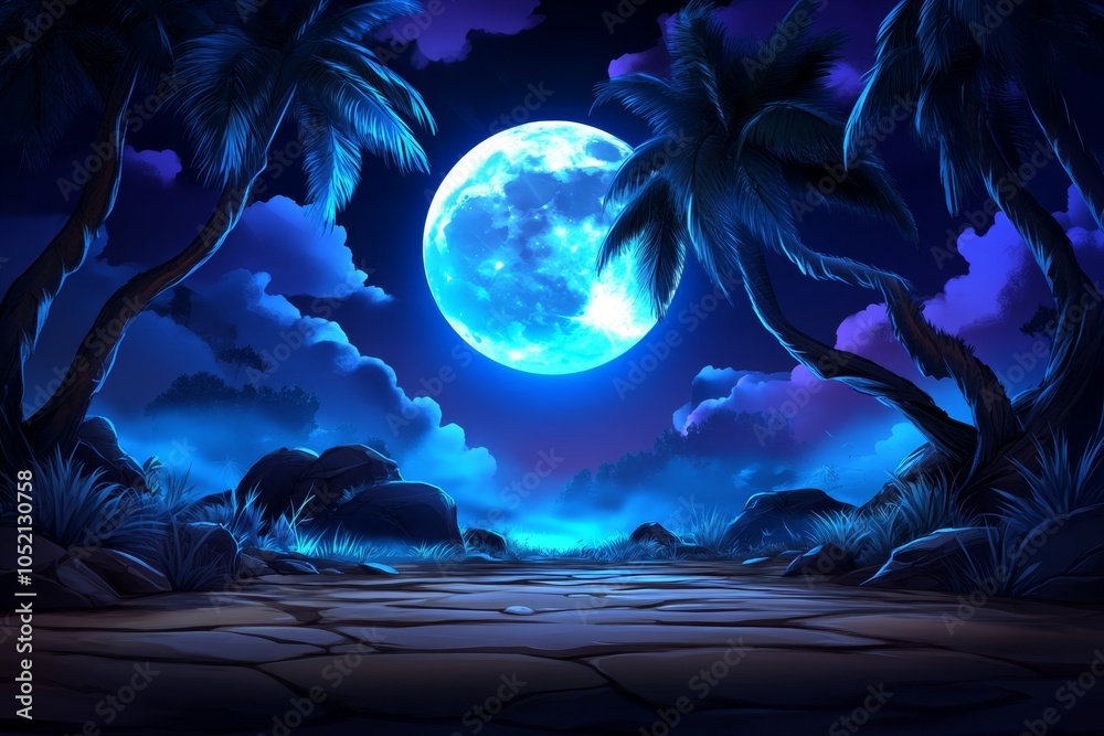 Wall mural a mysterious forest with mango and longan trees growing under a full moon, with fog and shadows addi - Wall murals Wall mural a mysterious forest with mango and longan trees growing under a full moon, with fog and shadows addi - Wall murals