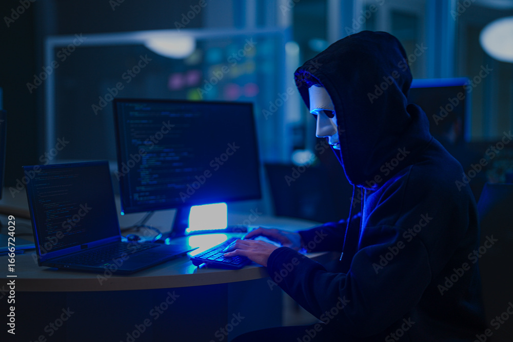 Wall mural a mysterious hooded hacker working on a computer in a dark room, illuminated by blue screen light. a - Wall murals Wall mural a mysterious hooded hacker working on a computer in a dark room, illuminated by blue screen light. a - Wall murals