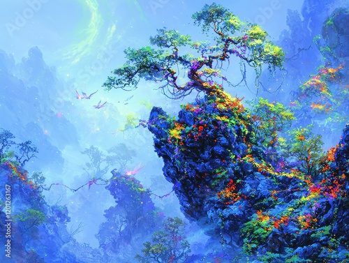 Wall mural a mystical floating forest of colossal bioluminescent trees, their branches extending into a swirlin - Wall murals Wall mural a mystical floating forest of colossal bioluminescent trees, their branches extending into a swirlin - Wall murals