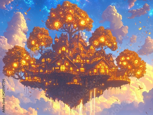 Wall mural a mystical floating island with radiant waterfalls cascading into the void below. glowing trees with - Wall murals Wall mural a mystical floating island with radiant waterfalls cascading into the void below. glowing trees with - Wall murals