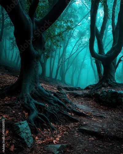 The watermark will not be included on Wall mural.: A mystical forest scene featuring tall trees with intricate roots, shrouded in fog and illuminated b