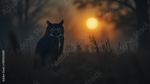 The watermark will not be included on Wall mural.: A mystical moonlit meadow silhouette of an owl where the subject is defined by its dark outline agai