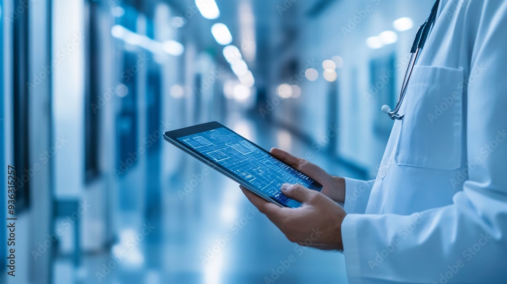 Wall mural a network architect analyzing complex data flow diagrams on a digital tablet in a modern office spac - Wall murals Wall mural a network architect analyzing complex data flow diagrams on a digital tablet in a modern office spac - Wall murals