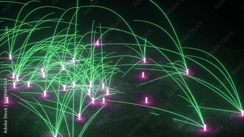 Wall mural : A network of green neon trails emerges from glowing nodes on a dark terrain in this 3d animation -