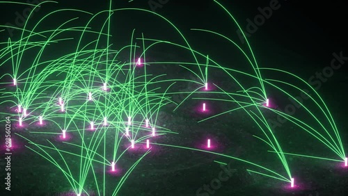 Wall mural a network of green neon trails emerges from glowing nodes on a dark terrain in this 3d animation.