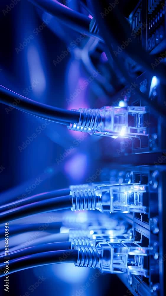 A network switch with glowing blue data cables in an internet server roomWall mural