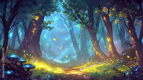 The watermark will not be included on Wall mural.: A painted path through the woods is illuminated by fireflies emerging from the surrounding foliage