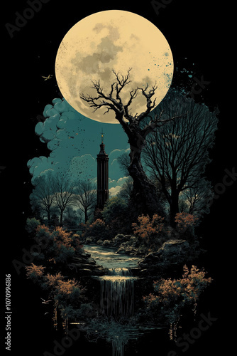 The watermark will not be included on Wall mural.: A painting of a tree in the middle of a forest with a full moon in the background