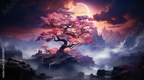 Wall mural : A painting of a tree in the middle of a mountain - generative ai