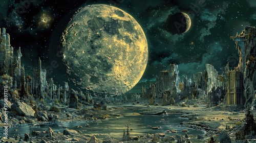 The watermark will not be included on Wall mural.: A painting of an alien landscape with a river running through it and a giant moon in the middle of t