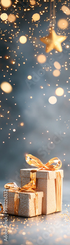 Wall mural a pair of gold boxes with a bow on top of them. the boxes are placed on a table with a star hanging