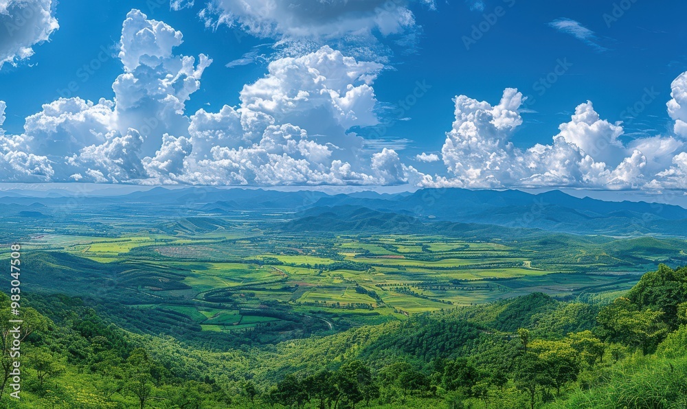 The watermark will not be included on Wall mural.: A panoramic view of a blue sky with fluffy white clouds, creating a calming effect - free copy space