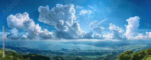 Wall mural a panoramic view of a blue sky with fluffy white clouds, creating a calming effect. free copy space