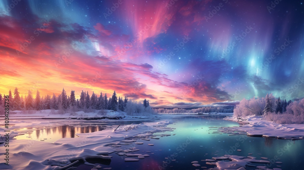 The watermark will not be included on Wall mural.: A panoramic view of the aurora borealis over a snow-covered plain