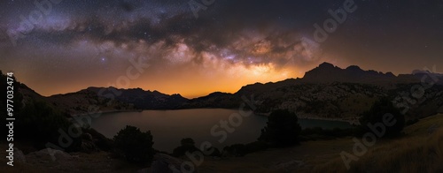 The watermark will not be included on Wall mural.: A panoramic view of the milky way and the comet neowise during a starry night