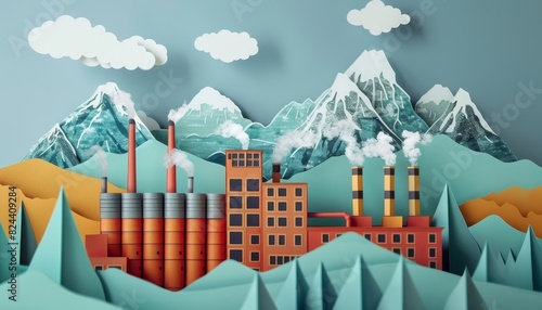 Wall mural : A paper drawing of a mountain range with a factory in the foreground by ai generated image