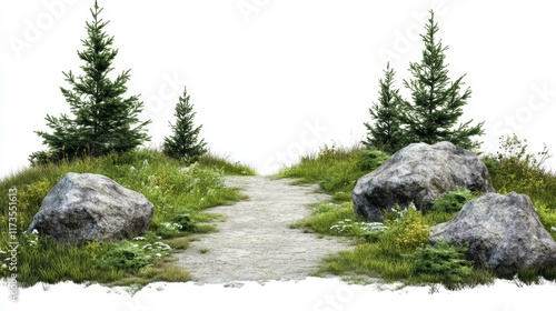 The watermark will not be included on Wall mural.: A path is shown between two trees and two large rocks