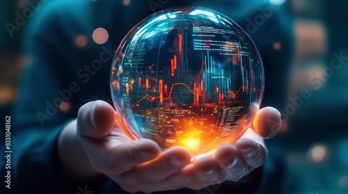 The watermark will not be included on Wall mural.: A person's hand holding a glowing orb with a digital display of data and charts inside -