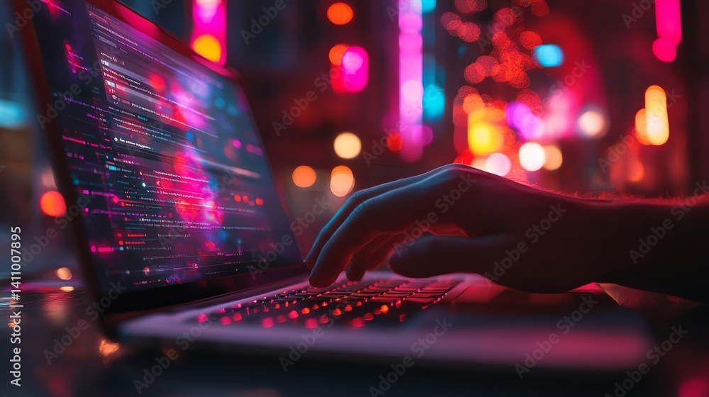 Wall mural a person's hand types code on a laptop at night with colorful city lights blurred in the background. - Wall murals Wall mural a person's hand types code on a laptop at night with colorful city lights blurred in the background. - Wall murals
