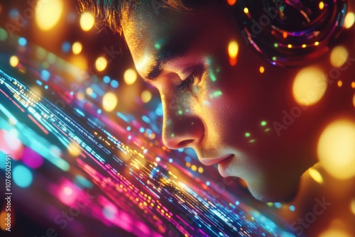 Wall mural a person focused on their computer screen with colorful lights in the background - Wall murals Wall mural a person focused on their computer screen with colorful lights in the background - Wall murals