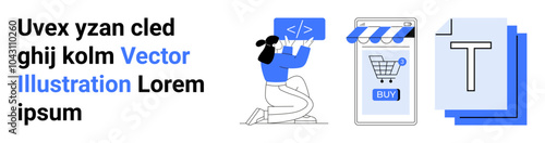 The watermark will not be included on Wall mural.: A person holding a coding symbol beside an online shopping app interface and stacked documents - idea