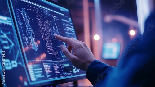 Wall mural a person interacting with a digital screen displaying technical schematics and data.