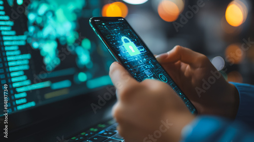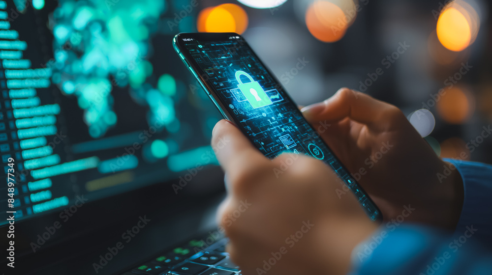 Wall mural a person is holding a cell phone with a green lock on it. the phone is displayed on a computer scree - Wall murals Wall mural a person is holding a cell phone with a green lock on it. the phone is displayed on a computer scree - Wall murals