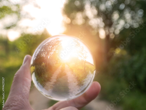 Wall mural a person is holding a clear glass ball that is reflecting the sunrise over a small country road, sel - Wall murals Wall mural a person is holding a clear glass ball that is reflecting the sunrise over a small country road, sel - Wall murals