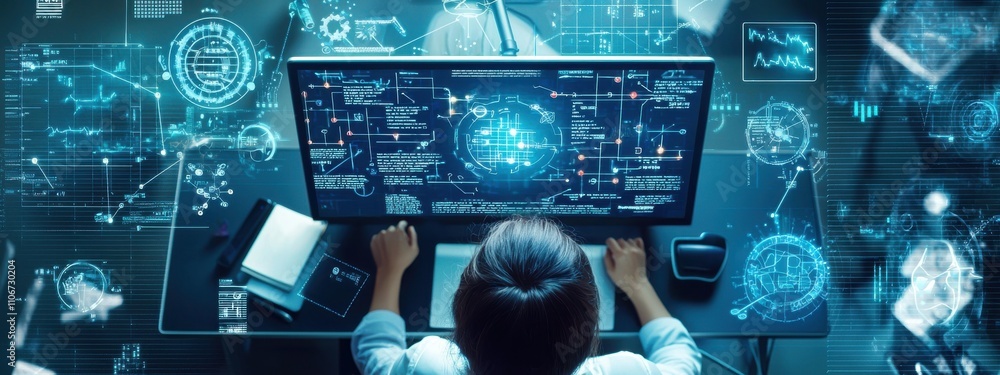 Wall mural a person is pointing at a computer screen with a blue background - Wall murals Wall mural a person is pointing at a computer screen with a blue background - Wall murals